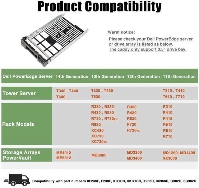 Part #: 0F238F, F238F, X968D, 0X968D, G302D, 0G302D,KG1CH; It Support 3.5 inch SAS or SATA drives, compatible for D.ell PowerEdge 14th Gen T340, T440, T640; D.ell PowerEdge 13th Gen R230, R330, T330, R430, T430, R530, T630, R730, R730xd, R930, XC430, XC730, XC730xd; D.ell PowerEdge 12th Gen R320, T320, R420, T420, R520, T620, R720, R720XD; PowerEdge 11th Generation R310, T310, R410, R415, T410, R510, R515, T610, R710, T710; PowerVault ME5012, ME4012, MD3600, MD3400, MD3200, NX3000, MD1200, MD1400.