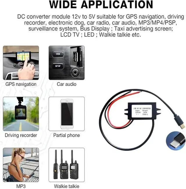 12V/24V to 5V 3A 15W Step Down Converter Type-C Module Power Adapter Compatible with Cell Phones