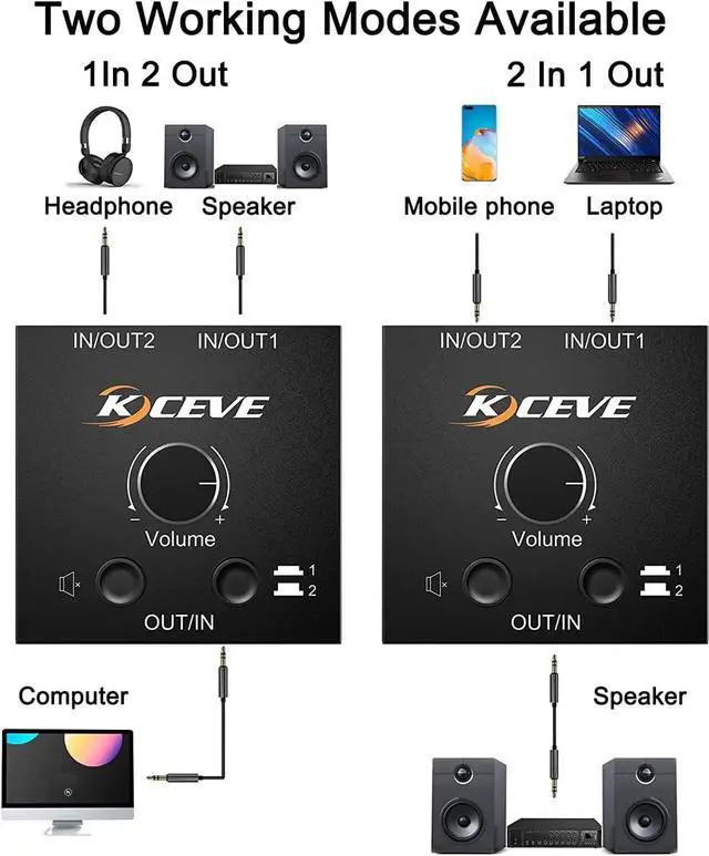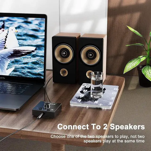 Easily connect two audio signals to one speaker at the same time, and then switch one output. (Note: not two simultaneous outputs)