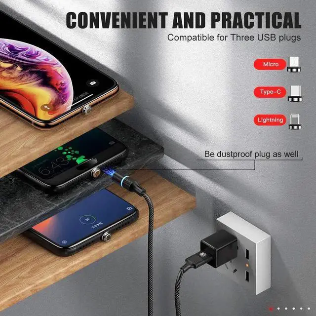 6.6FT / 2M Magnetic Charging Cable, 2 Pack Nylon Braided USB 3. A Fast Charging Cord with LED Light, Universal 3 in 1 Magnet Phone Charger Compatible with Micro USB, Type C Devices - 6.6 ft