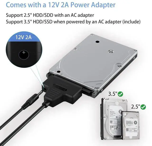 SATA to USB Adapter CableThe SATA to USB 3.0 and USB C Adapter Cable offers a convenient solution for transferring data from 3.5 and 2.5 inch SSD/HDD drives. With its external converter design and included 12V/2A power adapter, it simplifies the process of accessing and managing your storage devices.
