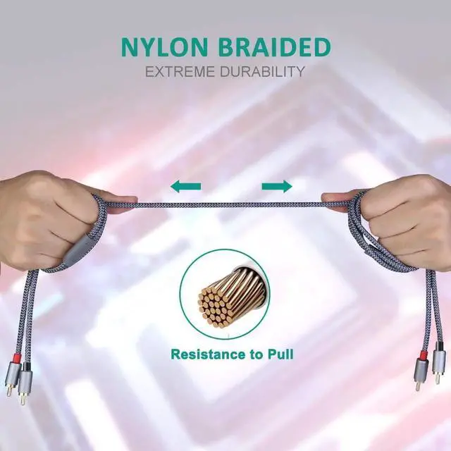 The 2RCA to 2RCA Cable Adds the strong military fiber, the most flexible, powerful and durable material, makes tensile force increased by 200%, special strain relief support design, can bear 15000+ bending test.