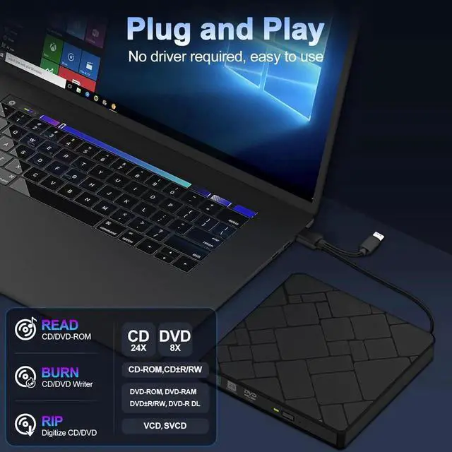 What Can this Disk Player Do? This cd rom external drive for pc supports reading, writing (burning) and ripping (copy) of CD±R/RW, CD-ROM, DVD±R/RW, DVD-RAM, VCD, and SVCD disc. This external cd drive for laptop does everything you would expect, play videos from a DVD, read files and burn DVDs too.