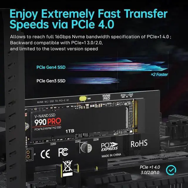 Up to PCIe 4.0:Supports PCIe 4.0 lanes, supports up to 16Gbps bandwidth, backward compatible with PCIe 1.0 2.0 3.0.