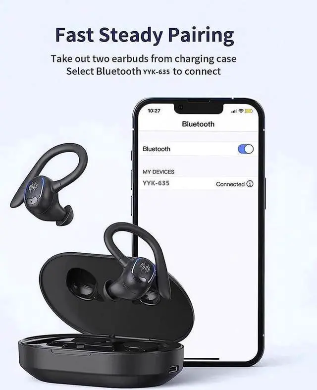[One Step Pairing] Take out the headphones from charging case, they will turn on and pair with each other, then select the YYK-635 to connect on your device's Bluetooth.