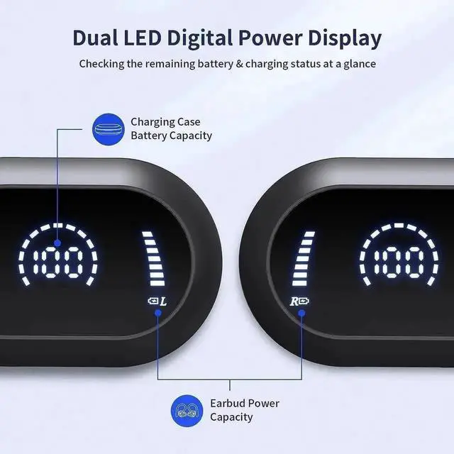 [50 Hours Playtime & Outer Dual LED Display] Wireless Earbuds' Playtime lasts for over 10 hours from single charge and total 50 hours with charging case. Dual digital LED power display outside of the case is to show the power level for charging case and bluetooth headphones.