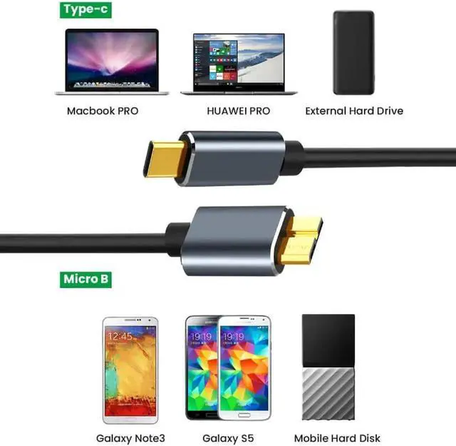 [ Universal Compatibility ] : This USB C to Micro B cable works for external hard drive such as Toshiba Canvio, Seagate and Western Digital (WD) My Passport and Elements hard drive, Samsung Galaxy Note3, iPad Pro 2018,MacBook Pro 13.3''. And Micro B To USB C Cable easily connects the external hard drive or Samsung galaxy S5 to your USB C devices