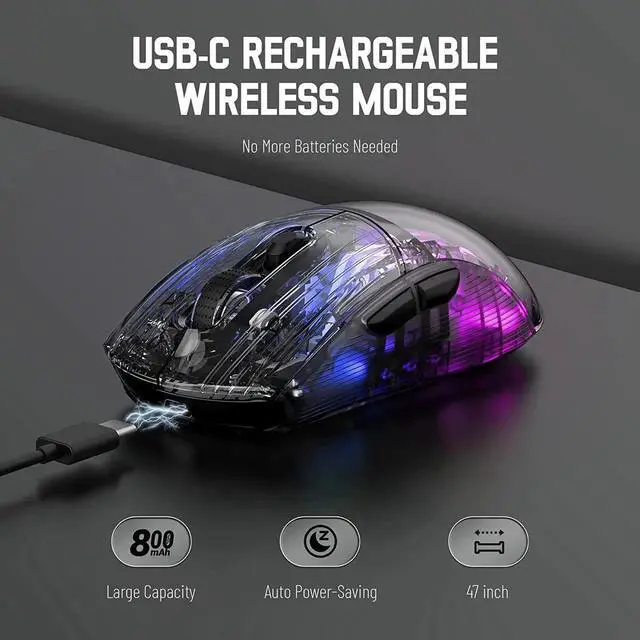 This gaming mouse, with a fully transparent shell and distinctive 3D RGB lighting, brightens your desktop.3 connection modes, whether it is gaming or office, you can easily handle it. The high-capacity lithium polymer battery supports use while charging. PAW3212 Gaming-grade chips give you a lag-free experience.