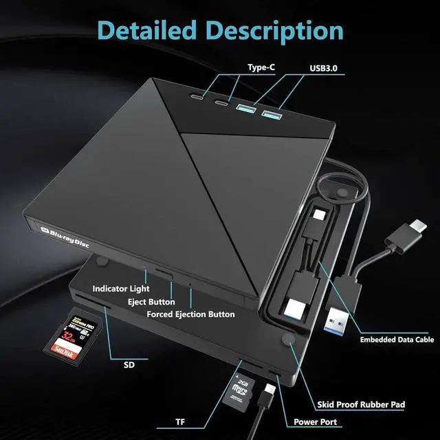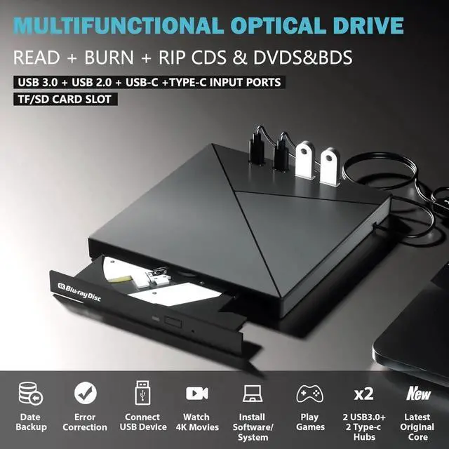 [7-in-1 Blu-ray Drive] The external blu-ray drive can not only burn and read CD/DVD/BD but also can be used as an external USB hub, including 1*USB 3.0 port, 3*USB 2.0 ports, 1*TF card slot, 1*SD card slot..