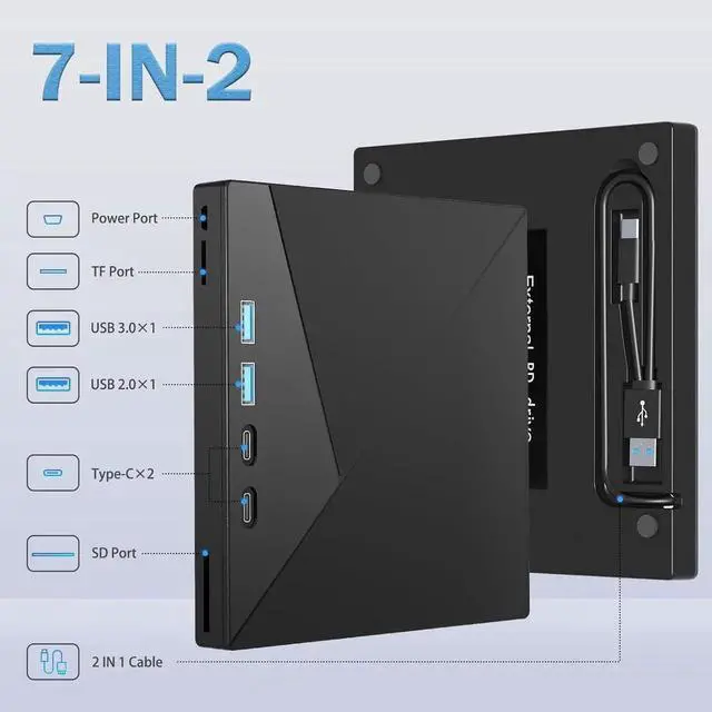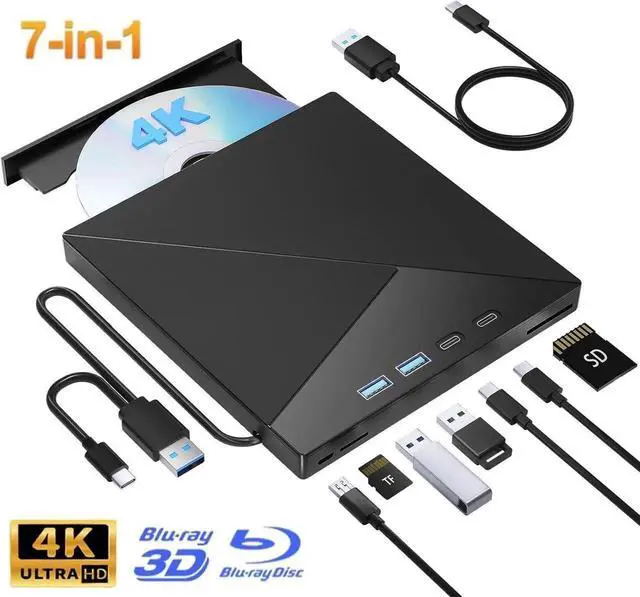 - Multifunction Blu Ray Drive:This 7 in 1 external 4K Bluray drive offers versatile features, plug and play. It can read and write BD/DVD/CD discs and has 1 SD card slot, 1 TF card slot, 2 Type-C ports, 1 USB 2.0 port , and 1 USB 3.0 port for data transfer or charging purposes. You can easily transfer music, 4k blu ray uhd movies, and data files from SD cards, TF cards, or through the USB/Type-C ports to your computer. Additionally, you can transfer files from a Bluray player to an SD card, USB hard drive, or USB flash drive. Please note that you can only use either the SD card or the TF card at a time. However, both can function simultaneously with the 2 USB ports.