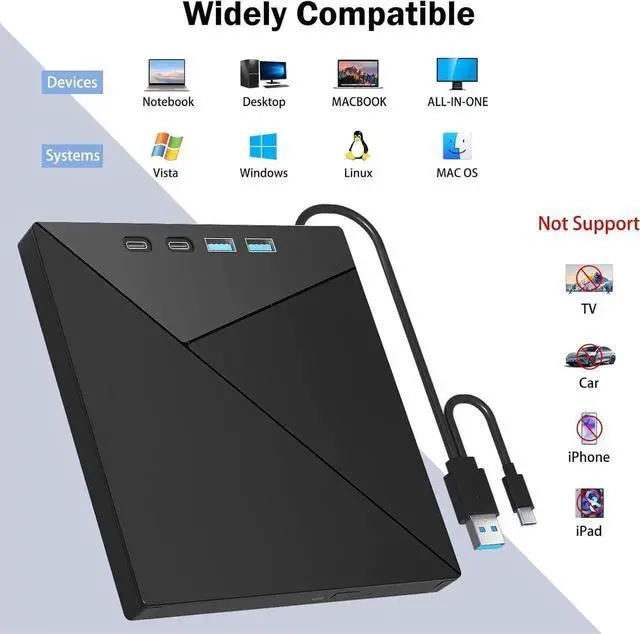 - Wide Compatibility: The blu ray drive external is fully compatible with a wide range of operating systems, including Windows 7, 8, 10, Vista, ME, SE, XP, and 2000, as well as Linux and all versions of MAC OS 10 or below. However, that it is not compatible with tablet iPads, Surface tablets, TVs, projectors, smartphones, or cars.