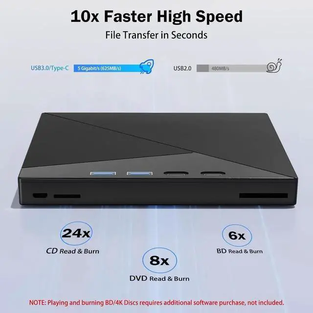 About this item- High Performance: The Bluray DVD drive has impressive high-performance capabilities. Its cutting-edge high-speed 3.0 interface and Type-C interface exhibit exceptional error correction capabilities, impact resistance, low noise, and low power consumption. It can read CDs at speeds of up to 24x, DVDs at up to 8x, and BDs at up to 6x. Additionally, it supports burning normal CDs and DVDs in sizes of 8.5GB, 4.7GB, and 700MB, as well as 3D discs.