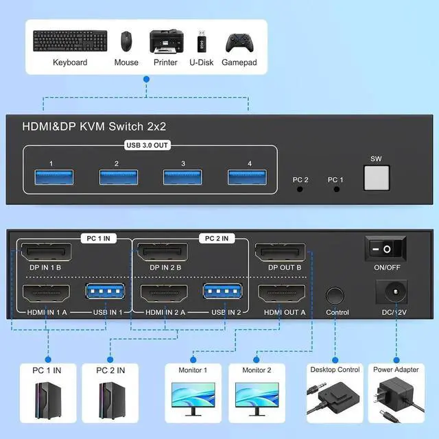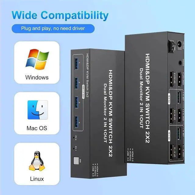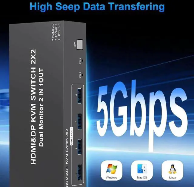5Gbps Ultra-fast Transferthis dp+hdmi 2 monitor kvm switch transfer files in Seconds. supports ultra-fast USB 3.0 data transfer rates of up to 5Gb/s. With 4 USB3.0 ports for peripheral USB devices such as keyboard, mouse, printer/scanner, etc.Support wireless keyboard and mouse.