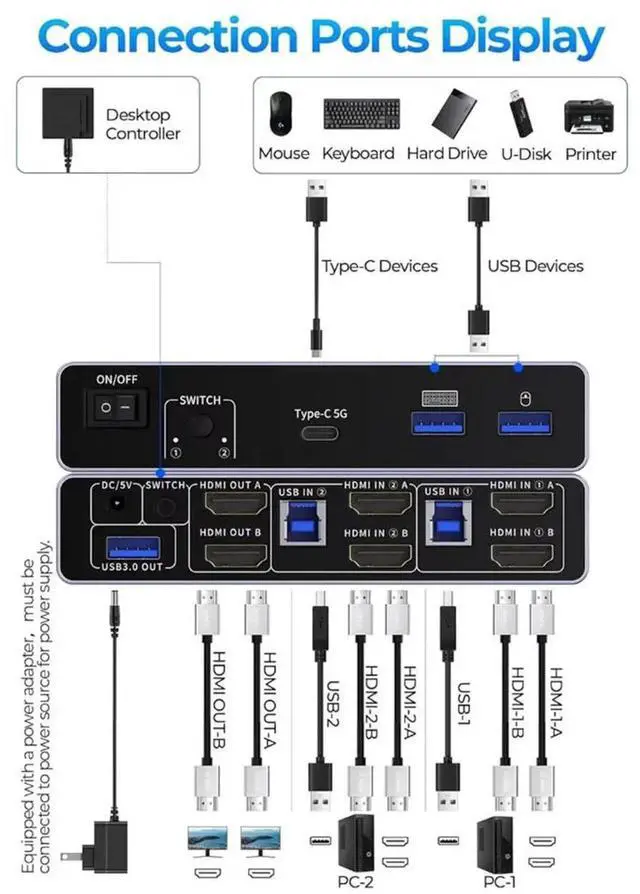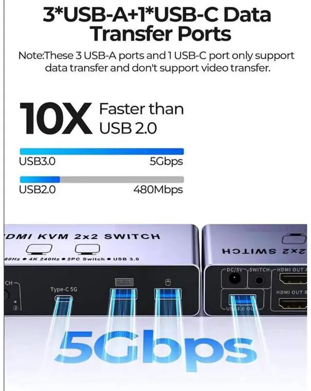 - This Dual Monitor HDMI KVM switch has 4 USB 3.0 ports (3 USB-A+1 USB-C) for sharing mouse, keyboard, USB flash drives, printer, and other USB devices.