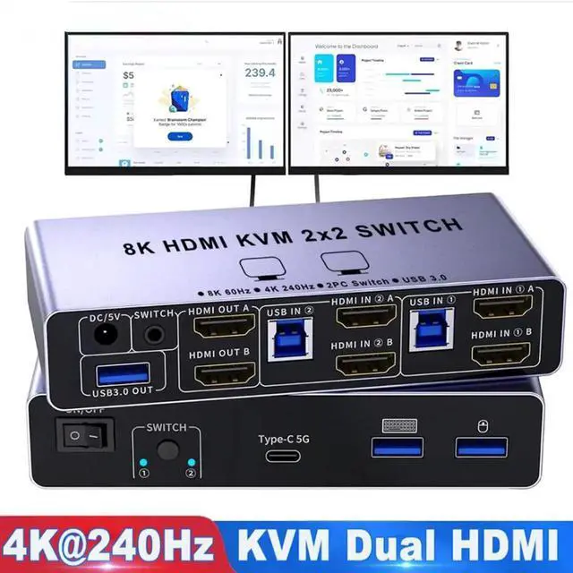 8K@60Hz HDMI KVM Switch 2 Monitors 2 Computers with 4 USB 3.0 ports (3 USB-A+1 USB-C)