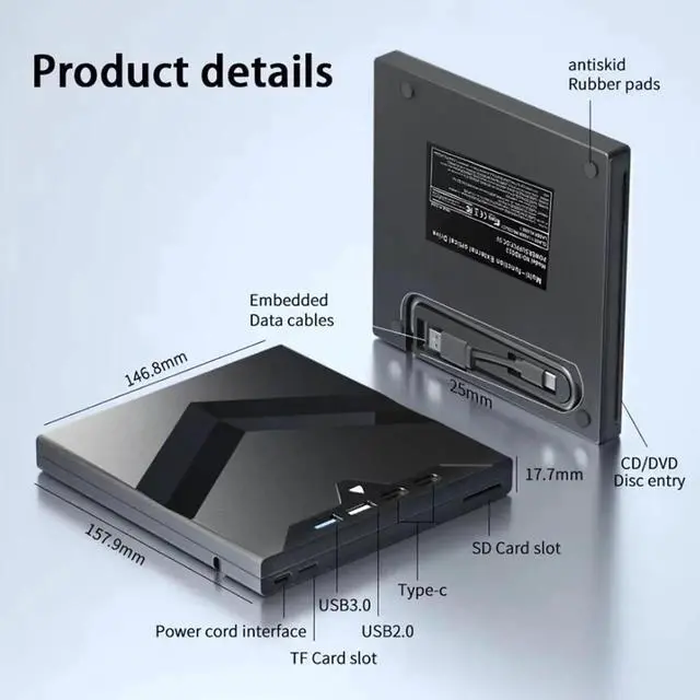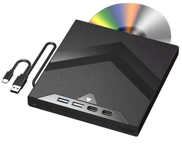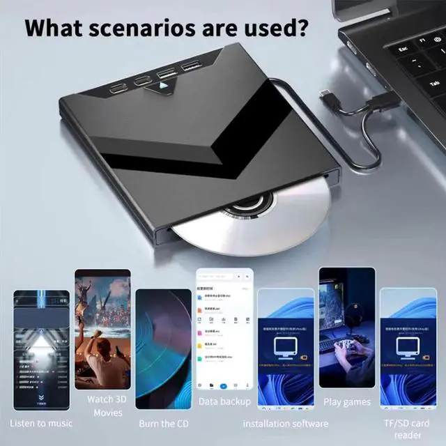 7-in-1 External CD/DVD driveThis optical drive adopts a suction type design, which can be plugged in and quickly read by the computer, minimizing the wear and tear of your disc to the greatest extent possible.The top design features a manual pop-up button, it is easy to operate. This dvd/cd player offers versatile features.( It has 1 SD card slot, 1 TF card slot, 1 USB 3.0 port,1 USB 2.0 port and 2 Type-C ports for data transfer.)High Speed TransferThis blu ray dvd drive comes with a hidden USB 3.0 and Type-C computer data transfer cable. The transmission speed is up to 5GBPS, which is 6 times faster than traditional USB 2.0 interfaces. This optical drive read and write speed of DVD is up to 8 times, and CD is up to 24 times.Widely CompatibleThis external cd/dvd drive compatible with Laptop/MacBook Pro/MacBook Air/PC,and running in Windows 11/10/8/7 and Mac OS. ( Please note that it does NOT support Blu-ray,cars,TVs,tablets,smartphones,projectors and chromebook.)