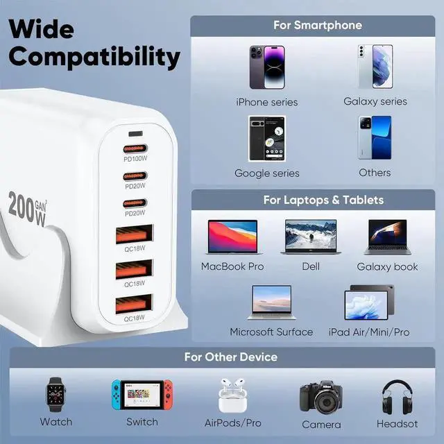 There are 3 PD USB C ports and 3 QC USB A ports (6-in-1 Fast Charger), with a total output power of 200W, making it the preferred charger for office and home users. While saving money, it also achieves faster charging speed and higher charging efficiency.