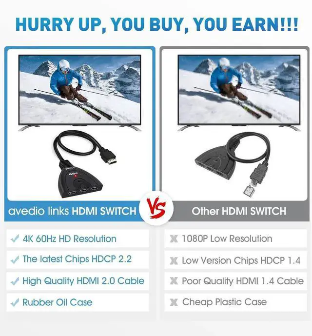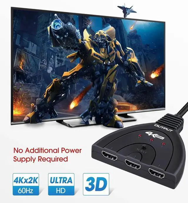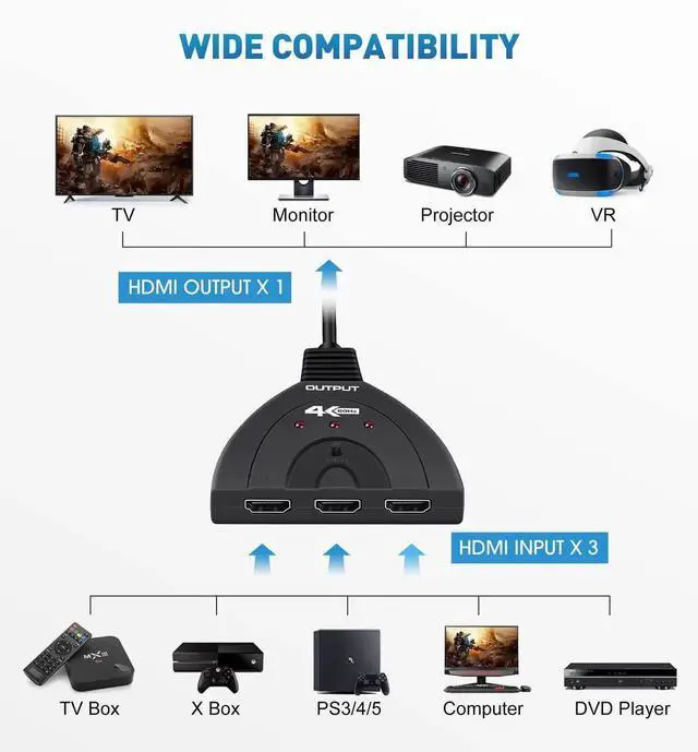 HDMI switcher 3 ports can switch the video and audio of three different HDMI input source (TV Box, etc.) to one HDMI displays (TV, Monitor, Projector, etc.) With a manual switch button on the top of the HDMI switcher box, you can easily switch between 3 HDMI sources without plug and unplug, which can protect all the devices.