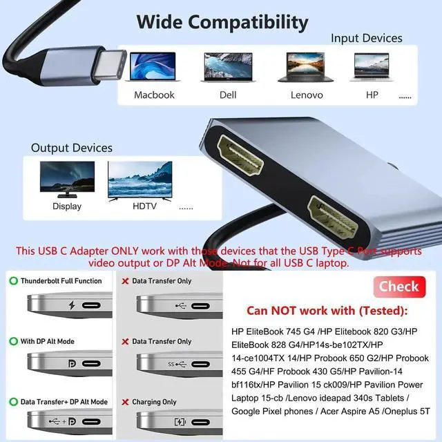 - [Wide Compatibility] 2 HDMI USB C adapter is an ideal adapter for compatibility with all Thunderbolt 3 [Plug and Play]USB C to dual HDMI adapter requires no additional drivers/software, it provides easy setup via USB Type-C port by native working on devices that support DP Alt Mode (Display Port Alt Mode), instantly turn your laptop, tablet or phone's USB-C port expands to dual HDMI ports. Computer adapter with a USB 3.0 interface, so that your mouse/ keyboard does not lag.