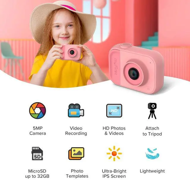 - [Durable, Cute, and Creative: 5MP Photos, 1080p Videos, Fun Frames, and Filters!] Let your childs imagination run wild! This toddler camera captures vibrant 5MP photos and stunning 1080p videos. The 2-inch IPS color screen helps frame and review every shot. Built tough with a durable and cute design, it also includes Fun Frames and Filters to add a playful, creative touch to every photo.