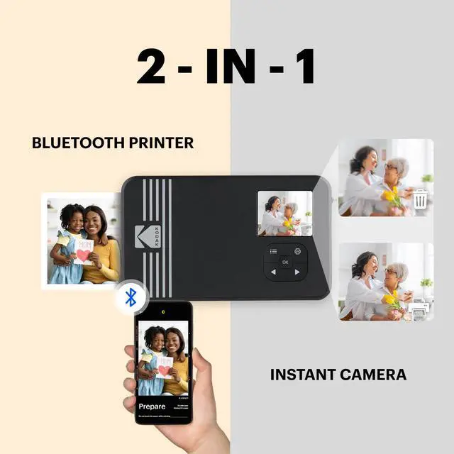 - Instant Camera + Photo Printer: The Kodak Mini Shot 2 Retro is a digital camera with a built-in photo printer, so you can print your images or cancel them after you have taken them. With this instant camera, you can also print 2.1x3.4" photos directly from the gallery of your mobile device via Bluetooth. Kodak Mini Shot 2 Retro is compatible with Apple iPhone, iPad & Android devices.