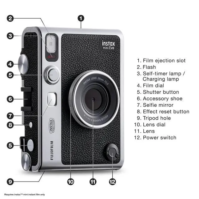 Show how you see the world with the Fujifilm instax mini Evo. Express yourself with 10 different film effects. Set the light just how you want it with 10 different lens effects. Experiment with brightness. Go retro. Soften the focus. Lose the color. Its your shot and youve got 100 different ways to take control. A top-of-the-line camera meets an instant printer packed with fun filters and effects. Our latest Fujifilm instax Evo-lution of hybrid instant camera/printer gives you endless possibilities to create and share. Twist the film dial, listen for that click and cycle through all 10 film effect filters. Tactile and satisfying. Turn the lens to cycle through 10 lens effects to make your image unique. Selfies are just an arms length away, thanks to the built-in selfie mirror. Frame yourself. Check the lighting. Take the shot. Yes, you are seeing double. The instax mini Evo has dual shutter buttons. One for portrait. One for landscape. Youre welcome. Keep your eye on the shot, even if your hands arent. Connect your Smartphone through the free instax mini Evo app and youve got a remote shutter button, perfect for selfies, group shots and complex set-ups. Exceed expectations. Adjust exposure, alter white balance, enable or disable flash, switch to macro mode for close-ups and when youre ready to step in front of the camera, hit the self-timer. All your shots deserve a print, even the ones in your Smartphone camera roll. Connect to the free instax mini Evo App on your Smartphone to select, edit, filter and print your MINI masterpiece. Starting with a classic design, weve streamlined the silhouette of the instax mini Evo with a sleek, luxurious, sharp finish. Download the instax mini Evo App, connect your Bluetooth-enabled Smartphone to your new favorite instant camera/printer and say hello to boundless features. Get the instax® experience with our Smartphone App Introducing the instax UP! App, a new way to keep all your instax® photos digitally in one place. Simply scan your physical instax® photos with your Smartphone to turn them into sharable, digital photos that you can edit, tag and save.