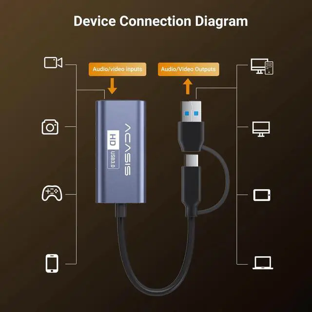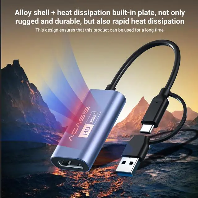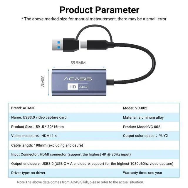 - A professional-grade HD capture card designed for creators and gamers, delivering smooth, clear, plug-and-play audiovisual experiences.Smooth HD Capture: 1080P @ 60fps high frame rate for buttery-smooth, true-to-life visuals.Extensive Compatibility: Full support for Windows/macOS, mainstream streaming software, and devices like PS5/Switch/cameras.Ultra-Low Latency Monitoring: Transmission latency as low as ~55ms for near real-time visual feedback and more responsive gameplay.Synchronized Audio Recording: Captures stereo audio directly via HDMI, ensuring perfect synchronization for complete recordings.Portable & Plug-and-Play: All-in-one cable design, no external power or drivers needed. Start creating instantly upon connection.II. Detailed Features & Specifications1. Professional Image Quality, Built for FluencyCaptures fluent HD video at up to 1920×1080 resolution and 60 frames per second. Utilizing the YUY2 color format, it delivers vivid, detail-rich visuals, perfectly meeting the demands of mainstream HD content creation like game streaming, course recording, and video production.2. Broad Compatibility, Connect All Your Creative GearSystems & Software: Seamlessly compatible with mainstream OS like Windows 10/11 and macOS. Works perfectly with popular streaming, recording, and communication software including OBS Studio, Streamlabs, PotPlayer, and Zoom.Source Devices: Easily connect to gaming consoles like PlayStation 5/4, Nintendo Switch, Xbox, as well as various video sources with HDMI output such as digital cameras, camcorders, and DVD players.3. Ultra-Low Latency Technology for Real-Time SyncFeatures optimized data transmission technology, keeping video capture latency between approximately 55ms and 80ms. This enables near real-time visual feedback when monitoring gameplay or video sources on your computer screen, enhancing live interaction and monitoring efficiency.4. Capture HD Video & Audio in One StepCaptures high-definition video while simultaneously recording high-quality stereo audio via the HDMI interface. Achieves precise audio-video synchronization without complex cabling, ensuring your content is cohesive and more engaging.5. Flexible Input for High-Quality SourcesThe HDMI input port supports signal passthrough of up to 4K@30Hz or 1080P@60Hz (captured and output at 1080P@60Hz). It readily accommodates high-spec video signals from next-gen gaming consoles and professional video equipment.6. Minimalist Design, Go Live Anywhere in SecondsThe all-in-one cable design eliminates complicated setup. With an integrated USB-C adapter and USB-A connector, it plugs directly into laptops or desktops. True "Plug-and-Play" functionality requires no additional driverssimply connect, and the device is quickly recognized. Start your creative journey anytime, anywhere with ultimate portability and ease.