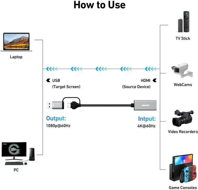 - 1080P Full HD Capture CardBENFEI Capture Card's HDMI input is compatible with HDMI 1.4b, resolution is up to 3840*2160@30hz with multiple format RGB444/YCBCR422/YCBCR444/YCBCR420 in deep color 24/30/36. USB output resolution is up to 1080P@60Hz with YUV422/MJPEG format. Audio signal is up to 48Khz. It supports easily recording Nintendo Switch/PS4/PS5/Xbox X series videos to streaming platforms with iPad/laptop/PC. Note: PS4/PS5 support this capture card when HDCP is turned off