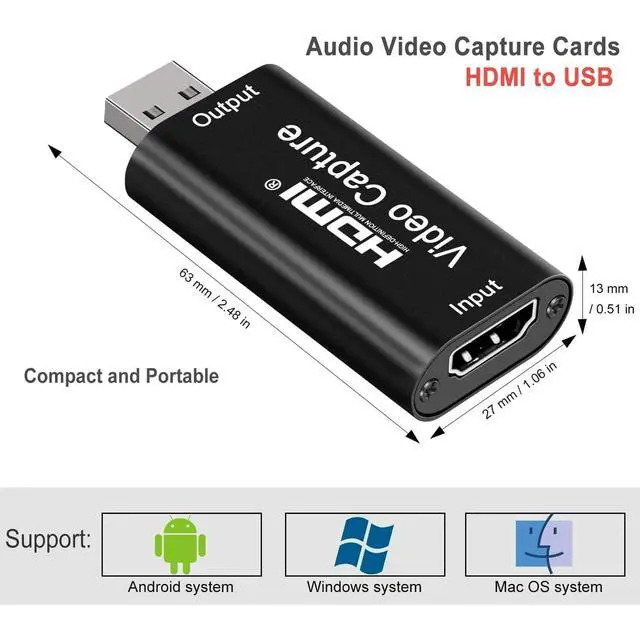 - HDMI to USB Capture CardOur capture card easily connect your DSLR,camcorder,or action Cam to your PC or Mac,Compatible with Windows,MAC and Linux.The USB2.0 high-speed transmission port makes it easier for you to have real-time streaming for Twitch,for Youtube,for OBS,for Potplayer and for VLC.The HDMI to USB Capture Card compatible with HDMI signal input such as camera,conference camera,computer,mobile phone,set-top box,PS4 / XBOX game console,etc.