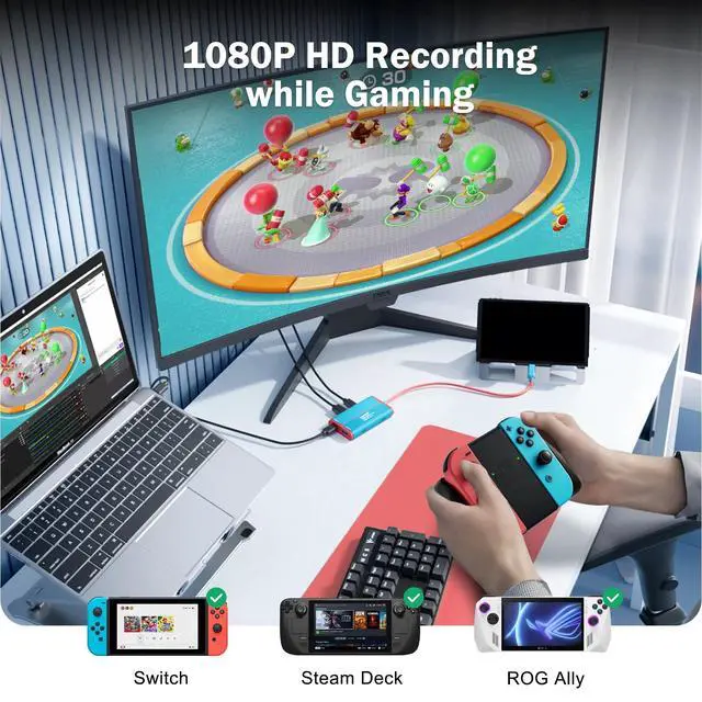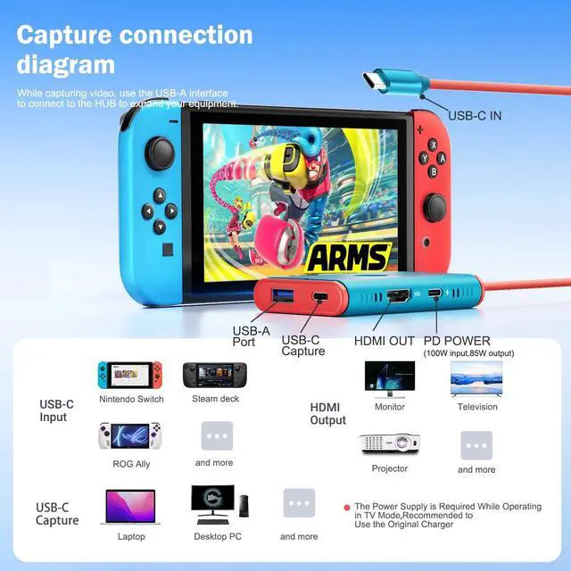 - Video Capture Card: Supports 1080P 60Hz HDTV input and outputs 1080P 60fps via USB 3.0. Compatible with live streaming software such as OBS and AMCap, it meets the needs of various scenarios, including game recording, live streaming, and meeting recording.Stable Performance: Enable TV mode on the Switch without a dock. Made of lightweight and portable ABS, it's durable and offers excellent heat dissipation, ensuring stable performance and clear image quality without blue screens or lag.USB C HUB: Equipped with HDMI output, USB Type-C 3.0 port, and 100W PD power delivery, it allows for simultaneous video expansion, data reading and writing, and device charging. It also supports USB flash drives and hard drives, providing an efficient and convenient connection experience.100W PD: Supports 100W power input and 85W output, capable of powering devices such as the Switch and PC, making it ideal for extended live streaming or gaming sessions. Strong compatibility: Compatible with multiple game consoles such as Windows 7/8/10, Mac OS, Linux, Android, PS5, Switch, Xbox, as well as devices such as Samsung Dex mode, Steam Deck, mobile phone/tablet screen projection, suitable for scenarios such as gaming, conferencing, teaching, and medical imaging.