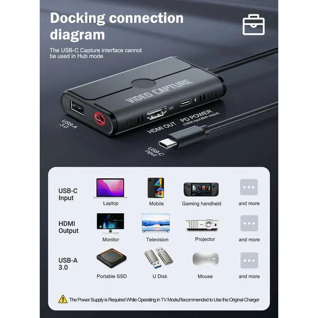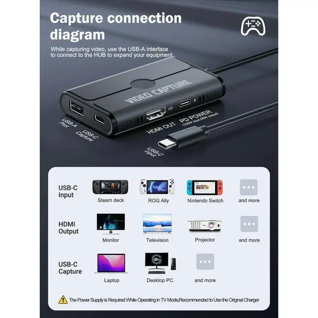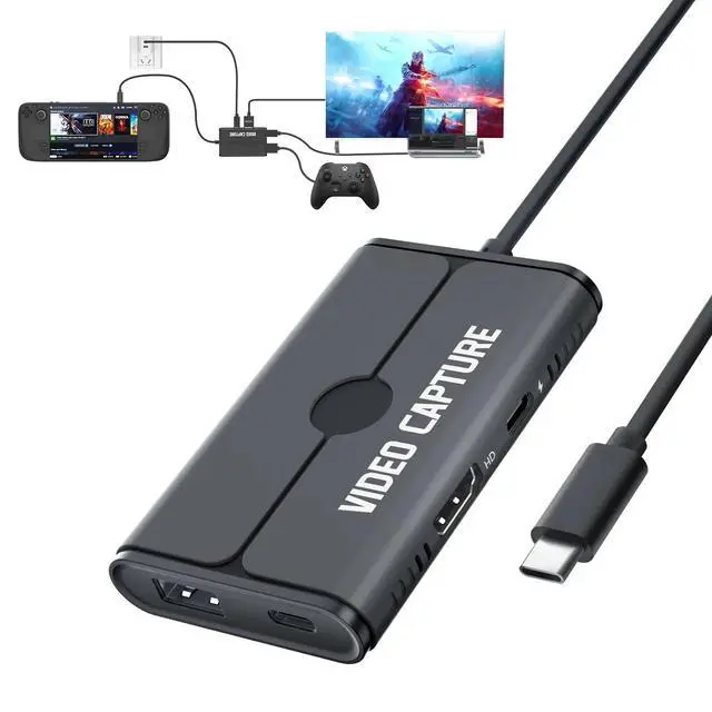 - Capture Card + Hub: This device functions as both a video capture card and a USB-C hub. The capture card provides 1080P@60Hz game recording or live streaming, making it suitable for recording, editing, and streaming games to platforms like OBS, AMCap, Xsplit, and VCL, while also connecting peripherals like storage drives and keyboards.Versatile Ports: Featuring HDMI, USB 3.0, and 100W Power Delivery charging ports, this device offers expandable connectivity to meet your diverse needs. The 1080P video output is compatible with most TVs, monitors, and projectors, while USB 3.0 delivers data transfer speeds up to 5Gbps for fast file transfers. It supports 100W Power Delivery input and provides a stable 85W output.Supports Samsung Dex and Mobile Desktop Mode: Turn your Samsung phone into a PC. Connect a monitor, mouse, and keyboard for full-screen work or entertainment. Compatible with the Samsung Galaxy S10/S9/S8 Plus/Note 10/Note 9/Note 8, the Tab S4/S5/S6 in Dex mode, and more devices equipped with a standard USB 3.1 port. (Note: HDMI cable and power adapter are not included).This capture card is compatible with Steam Deck, Nintendo Switch, ROG Ally/Steam Deck, iPhone/iPad/Notebook, and other devices. It can be used as a Nintendo Switch dock replacement, allowing you to capture or livestream your games on the big screen. It connects seamlessly with OBS, XSplit, Zoom, TikTok, YouTube, and other streaming services plug and play. This HDMI capture card is suitable for HD capture, game live streaming, conference room projection, game recording, educational audio and video recording, medical imaging, and more.Notes:1. Power is required when operating in TV mode; using the original charger is recommended. 2. The dock can charge the Nintendo Switch Lite but does not support screen projection.