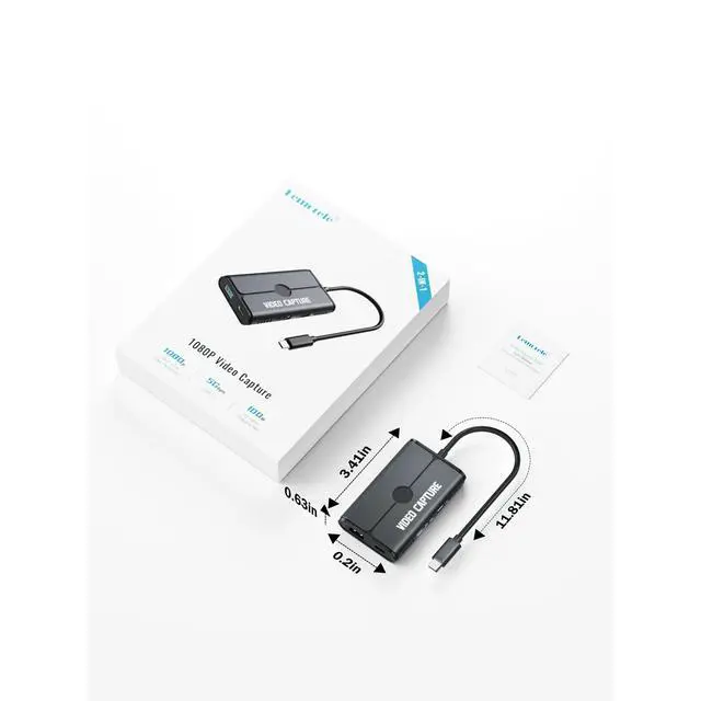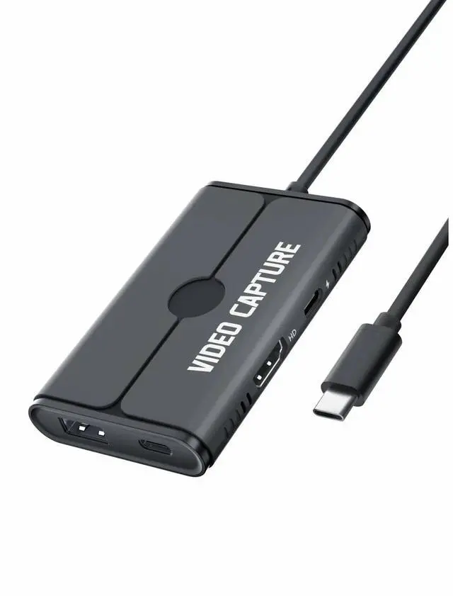 The DIXSG 2-in-1 USB-C Video Capture Card and Hub combines audio and video recording with expanded connectivity, making it ideal for gamers, streamers, and professionals. It supports 1080P@60Hz HDMI capture, features a USB 3.0 data port (5Gbps), and supports 100W Power Delivery fast charging. Compatible with devices like Steam Deck, Nintendo Switch, Samsung Dex, smartphones, and laptops, this adapter functions as both a capture card and a docking hub. Whether you're streaming, gaming, or working in Dex mode, this dongle has you covered. Product Specifications: Input: USB-C 3.0 (30cm cable). Output Ports: 1x HDMI 1080P @ 60Hz; 1x USB-A 3.0 (5Gbps); 1x USB-C (for connecting to a console); 1x PD (100W input, 85W output); Compatibility: Steam, Nintendo Switch, ROG Ally, Samsung Dex, Windows, macOS, Android, iOS, iPhone, etc. Material: ABS, gray-black; Weight and Dimensions: 0.24 lb, 4.09 x 5.28 x 0.79 inches. Includes: 1 Capture Hub, 1 User Manual.