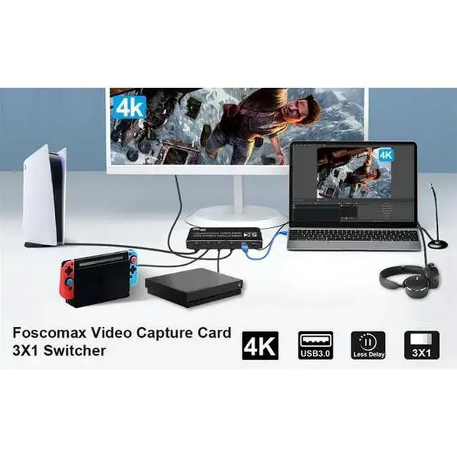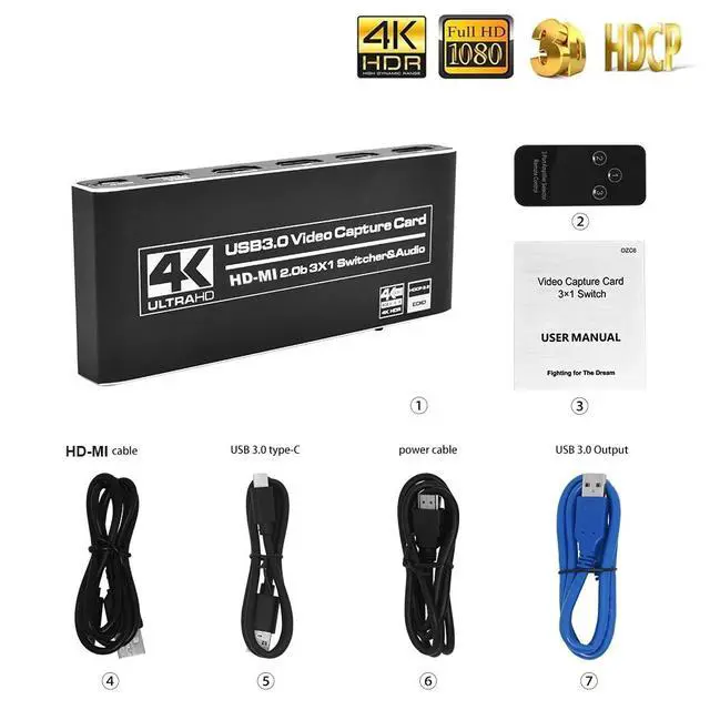 3X1 HDMI Switch Video Capture Cards HDMI to USB 1080P USB3.0 Record via DSLR Camcorder Action Cam to PC or Mac. HDMI video capture can captureboth HDMI video and HDMI audio, send audio and video signals to computers or smart phones for preview and storage, Suitable for high definition acquisition, teaching recording, medical imaging, etc. Specifications: Input: HDMI Port x 3, Mic Port x 1 Output: USB3.0 Port x 1, HDMI x 1, Audio x 1 HDMI Video Input: 4K@60Hz HDMI HD interface HDMI Audio Input: LPCM Audio Signal Output Color Space: YUY2, RGB24 With ultra HD(4K) game capture, you can record the game more easily. No need to install any driver, you can use any 3rd party software to capture or stream your HD game , or other HD video source. The video capture card switcher can be used for video conference, game collection, multimedia teaching scenario etc, it has superior performance and compatibility than the previous versions. HDMI output support 4K/60FPS 4K/30FPS or 1080P/60FPS.