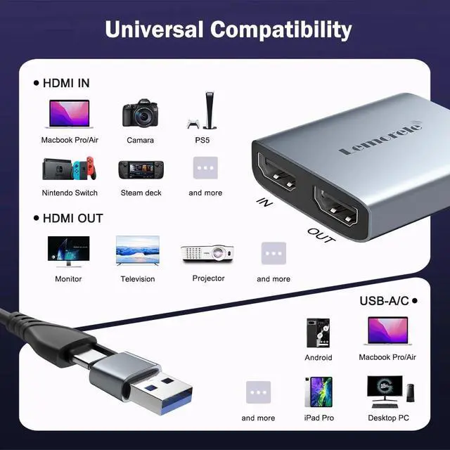 - The Lemorele 1080P@60Hz loop-through video capture card features two HDMI ports with loop-through functionality, allowing direct connection to large displays. While recording or livestreaming, you can preview the video in real time on a second screen, making it ideal for game streaming, tutorial recording, or live demonstrations.