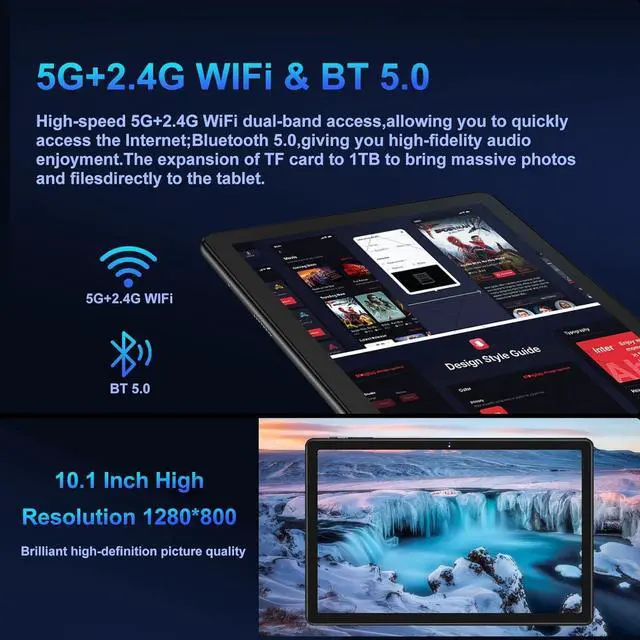 FUNCTION 5G/ 2.4G WI-FI & GPS 10.1 inch tablet supports 5G/ 2.4G high-speed Wi-Fi, 5G band speed is faster and improves the stability of the network connection; In addition, it is equipped with GPS function, which can obtain location information through GPS and Goo/gle Maps, providing accurate positioning services anytime and anywhere.