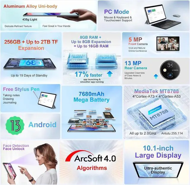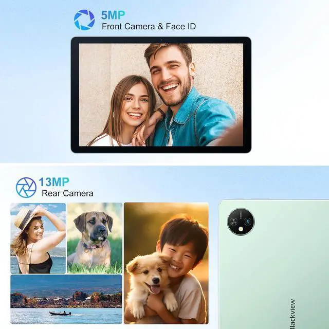 Widevine L1+Arcsoft 13MP+Wireless Screen CastingBlackview tablet 10 inch Support Widevine L1 and Wireless Screen Casting, so that you have a more colorful visual experience, while equipped with Arcsoft support multiple modes, Panorama mode, HDR mode, Night mode, Protrait mode, Photograph mode, allowing you to record the wonderful moments of life!