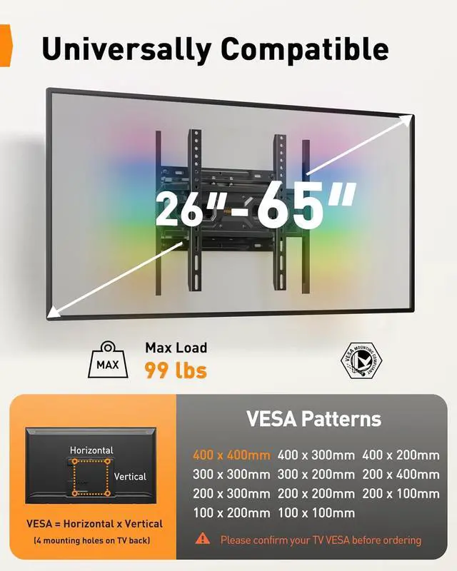 Wide Compatibility: The full motion TV wall mount with light bar is compatible with most 26-65 flat or curved TVs up to 99 lbs with VESA patterns 100x100 to 400x400mm. The 55 inch TV Wall Mount can be installed on 12 to 16 wood studs, solid concrete or brick walls. Please verify the size, weight, and VESA pattern of your TV before purchase. If your stud spacing exceeds 16, please contact us for a TV Wall Mount Extension Bracket that accommodates wood studs spaced up to 24 apart.