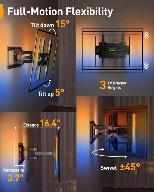 Ultimate Flexibility: Our full motion TV mount offers flexibility with 16.4 arm extension to bring your TV closer and +/-45° swivel to redirect the screen. You can also retract it back 3.7 from the wall to save space. Reduce glare with +5°/-15° screen tilt to avoid reflections from light sources.