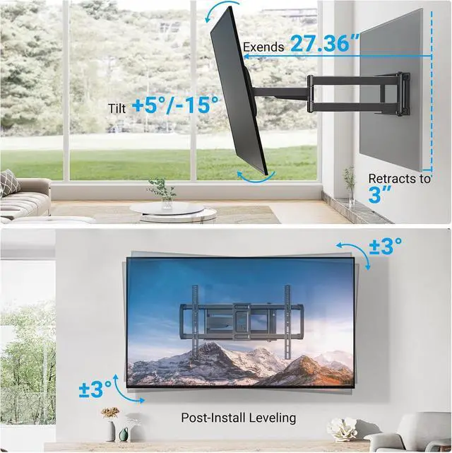 27.36 INCH LONG ARM EXTENSION: Extra long arm TV wall mount can extend up to 27.36" from the wall and sit as close as 3" from the wall. When fully extended, swivel the TV left or right 90 degrees to direct the screen toward your viewing position.