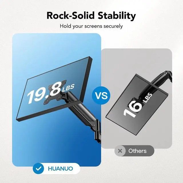 Rock-Solid Stability for an Ultimate Experience: Elevate your monitor setup with Huanuo triple monitor mount designed for ultimate stability. Constructed from aerospace-grade aluminum and featuring robust arms, this stand supports up to 19.8 lbs per arm without sag or wobble. Each arm has been rigorously tested to handle 20,000 lift cycles, ensuring it remains steadfast and reliable.