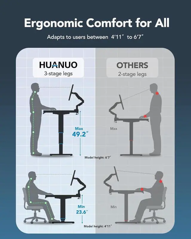 Wider Height Adjustment: This upgraded standing desk frame features three-stage legs with a wider height adjustment range of 23.6 to 49.2 (suitable for users between 411 and 67 tall). Compared to two-stage legs, it provides greater flexibility and smoother adjustment. It also has four custom height settings for easy transitions between sitting & standing.
