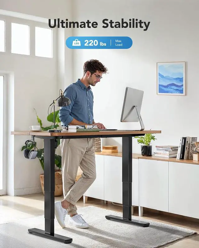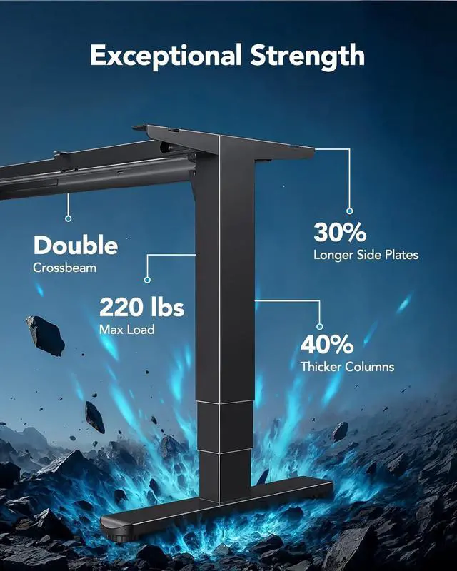 Sturdy & Stable Frame: Our adjustable desk frame is made from high-quality cold-rolled steel with 30% longer side plates, 40% thicker columns, and a double crossbeam. These upgrades ensure solid support for larger desktops and heavy items, with a Max load of 220 lbs.