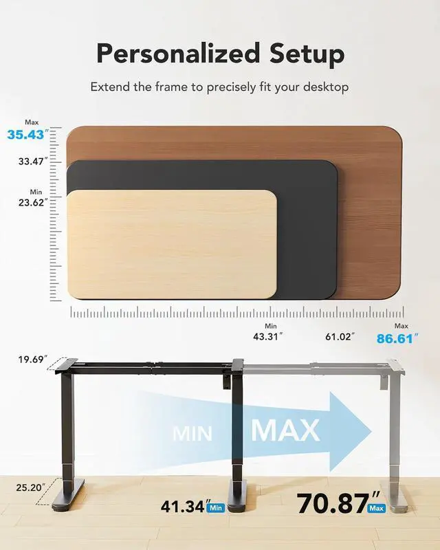 DIY Your Desktop: This sit-stand desk frame features adjustable crossbars that fit desktops ranging from 35.43 to 86.61 wide and 23.62 to 43.31 deep. Choose your desktop material, size, and color. Create the ideal work or study space tailored to your style and needs!