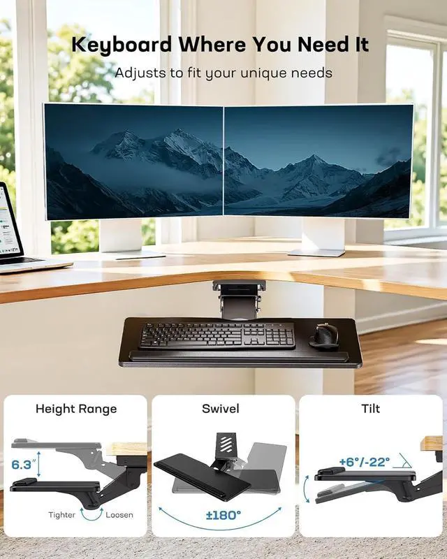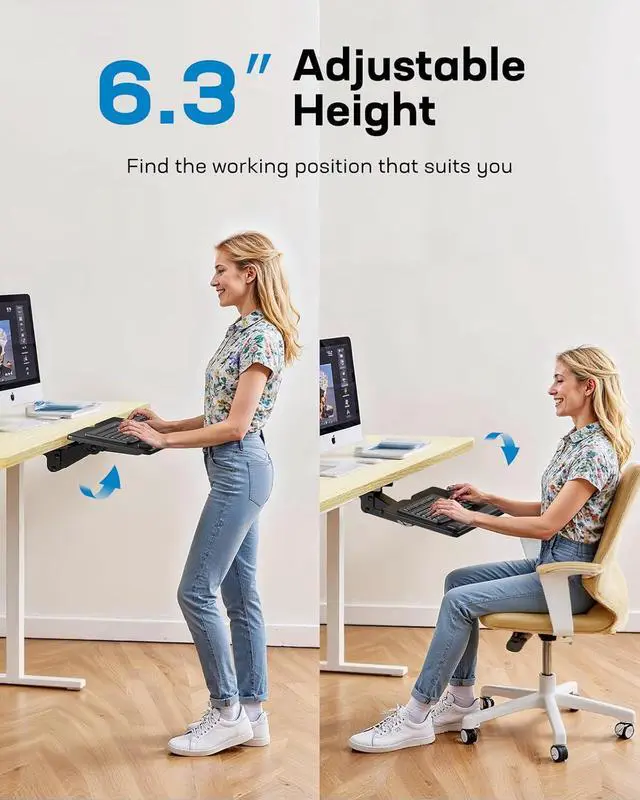 Flexible Height and Angle Adjustment: With 6.3 height adjustment, this keyboard tray with wrist rest pad supports both seated and standing typing for optimal ergonomic comfort. It can also swivel 180° left and right, tilt 6° up and 22° down for improved working comfort. Perfect for rectangular, L-shaped desks, and multi-tasking workstations.