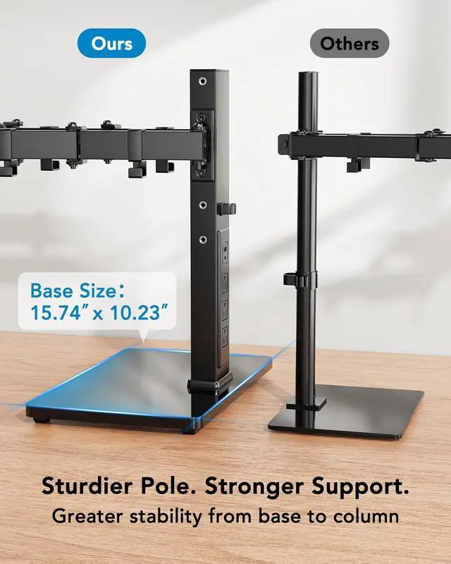Stable Glass Base: This dual monitor mount with power outlet features a large and sturdy tempered glass base, providing strong support for the desk monitor stand. The double monitor stand is designed with a 1.57 x 2.76 rectangular column, which is exceptionally thick to ensure maximum stability. Each arm can support up to 22 lbs, ensuring the monitors stay securely in place even when it's moving or being adjusted.