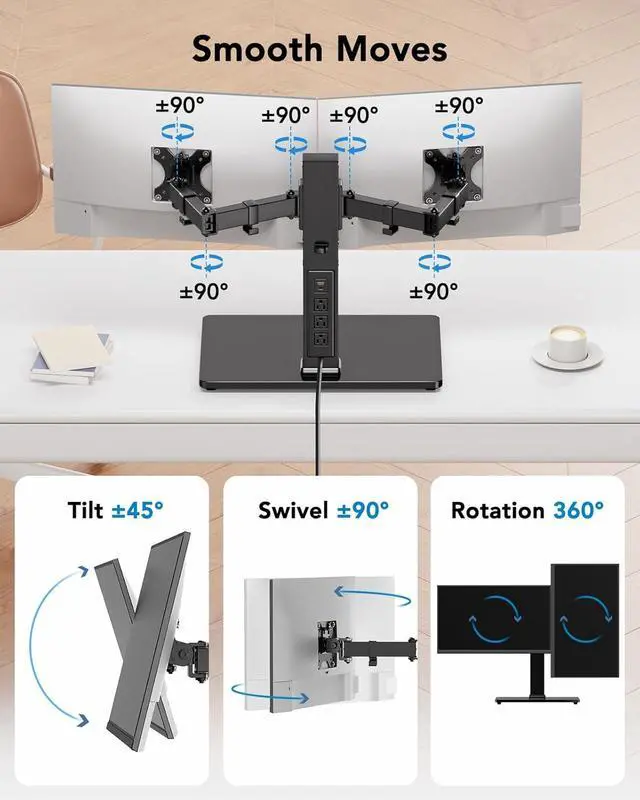 Full Motion Adjustable Arms: The monitor mounts for 2 monitors comes with fully adjustable arms, supporting ±45° tilt, ±90° swivel, and 360° rotation, with a maximum arm extension of 31.5. This flexibility of the monitor stands for 2 monitors allows you to adjust your monitor to the most comfortable angle, whether for multitasking, gaming, or collaborative work optimizing your workflow.
