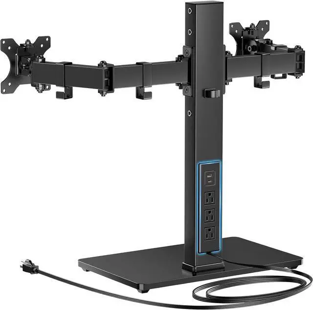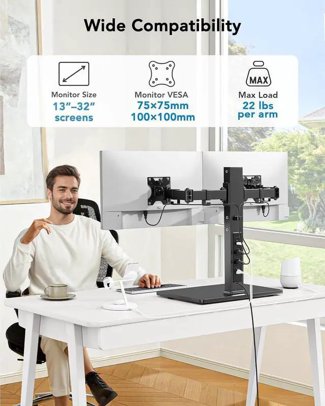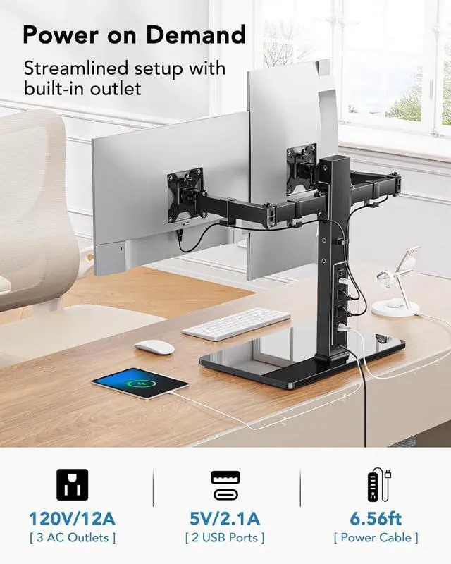 Dual Monitor Mount with Power Outlet: This dual monitor stand includes an integrated power outlet with one USB-A port, one USB-C port, and three AC outlets, plus a 6.5 ft power cord. No need for extra power sockets reducing desktop clutter and making your workspace more efficient. This vesa monitor mount supports 13 to 32 monitors in landscape mode and up to 29 in portrait mode, compatible with VESA 75x75mm and 100x100mm.