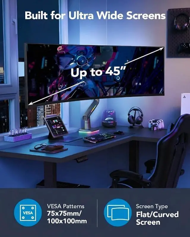 Engineered for 45 inch and Smaller Monitors: Designed for 45-inch and smaller monitors, this heavy-duty arm is compatible with VESA 100x100mm or 75x75mm. It supports a range of displays, from large 45-inch ultrawide curved screens to smaller monitors. The included C-clamp or grommet mount fits desks up to 3.5" thick, ensuring a stable and secure fit for your monitor.