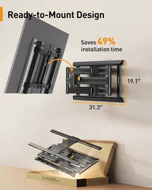 Faster Installation with Innovative Design: The pre-assembled and ready-to-mount design makes installation easier and faster, saving 49% of installation time. This TV mount comes with detailed instructions, complete hardware, a bubble level and a drilling template for hassle-free installation. Plus, you can level your TV +/3° after installation for precise alignment.