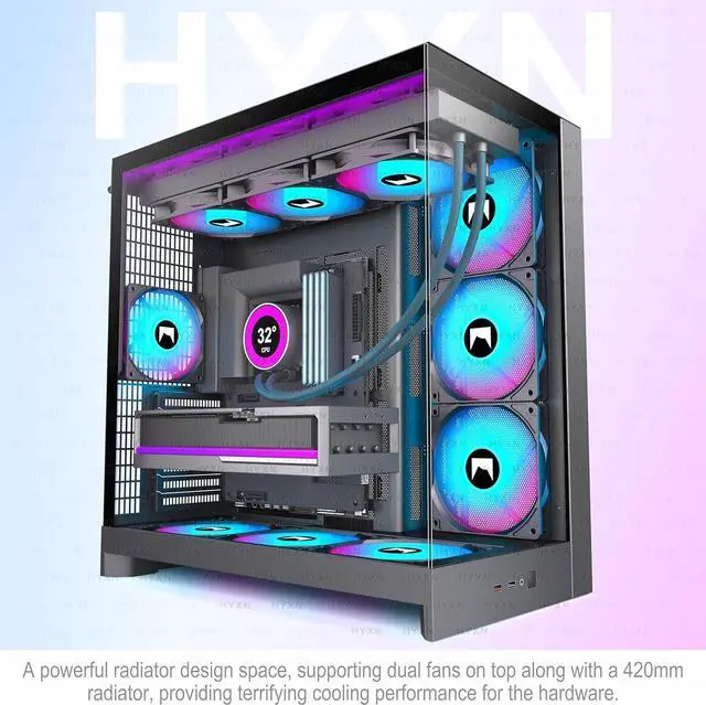 Large radiator system supporting 420mm radiators (compatible with dual-layer fan configurations), accommodating either 2x420mm or 3x360mm radiators simultaneously.